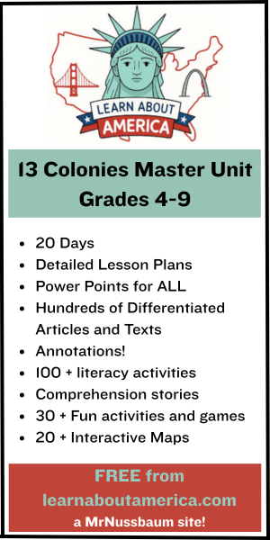 This awesome map allows students to click on any of the colonies or major cities in the colonies to learn all about their histories and characteristics from a single map and page! Below this map is an interactive scavenger hunt. Answer the multiple choice questions by using the interactive map. You'll get immediate feedback. Alternatively, you can print out the scavenger hunt.
