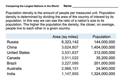 This activity explains the concept of population density and challenges students to find the population densities of the world's ten largest nations by area.