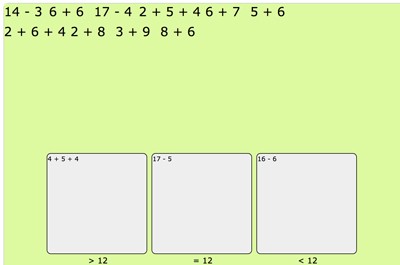This "containers" exercise requires students to drag and drop math problems to different containers depending on their sums. It gives immediate feedback.