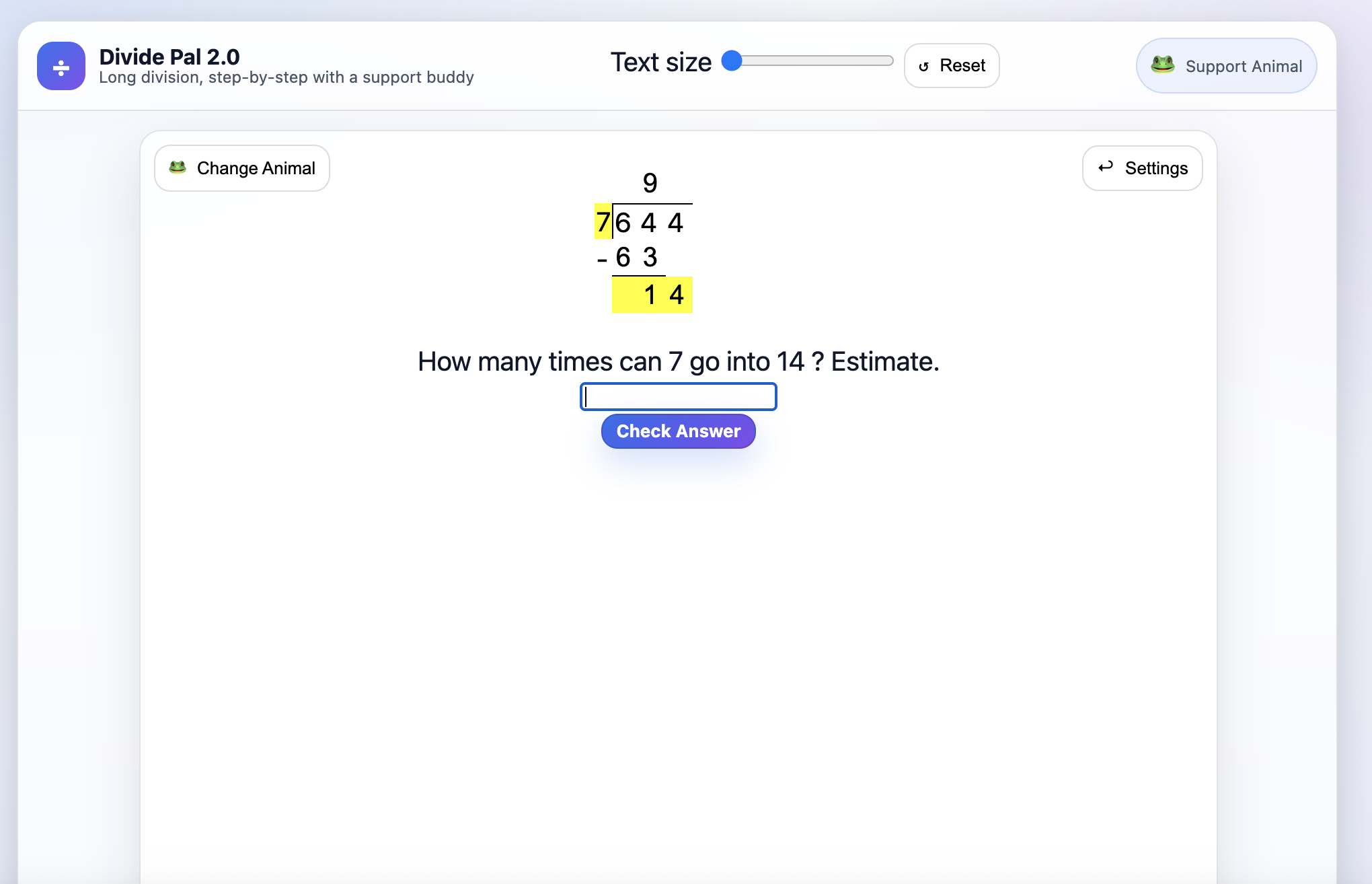 Divide Pal 2.0 is an engaging long-division practice game where students solve problems step-by-step while receiving instant feedback and encouragement. Learners can choose a fun “support animal” that celebrates correct answers and offers motivating messages when they need a boost, making math practice more personal and positive. With adjustable text size and a celebratory finish banner, Divide Pal 2.0 creates a focused, confidence-building experience for mastering division skills.