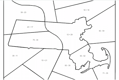 This fun math worksheet challenges students to use their two-digit addition and subtraction skills to correctly color Massachusetts from the mosaic.