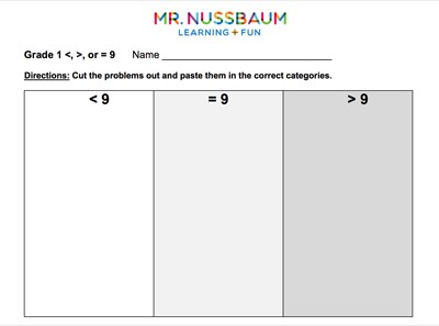 Students must use <, >, or = to categorize numbers compared to nine.