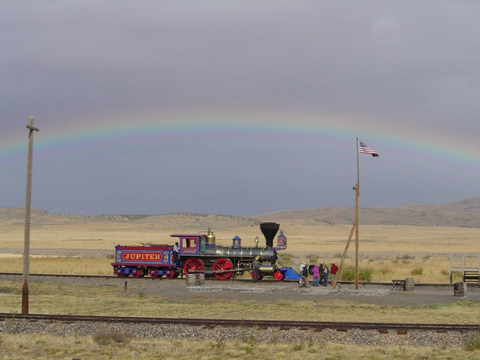 The Golden Spike was a ceremonial golden railway spike hammered into the ground by Leland Stanford on May 10, 1869 in Promontory Summit, Utah. The Golden Spike marked the completion of the world’s first Transcontinental Railroad, as the Central Pacific and Union Pacific Railroads met. The completion of the Transcontinental Railroad allowed people to travel from coast to coast in about seven days. Before the railroad, the same trip would have taken months. |