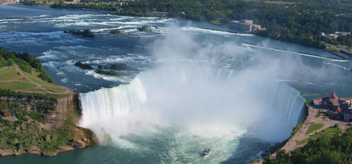 Shared by the United States and Canada, Niagara Falls is the most voluminous waterfall in North America, and one of the world’s most spectacular sights. The word"Niagara" is said to mean "Thunder of Waters" in Iroquois language. The falls attract millions of visitors each year and are also a valuable source of hydroelectric power. Niagara Falls is actually comprised of three different falls: Horseshoe Falls, American Falls, and the smaller Bridal Veil Falls. Visitors to the falls can ride The Maid of the Mist, a boat that travels in back of Horseshoe Falls, where they get sprayed with mist generated from the falling water. |
