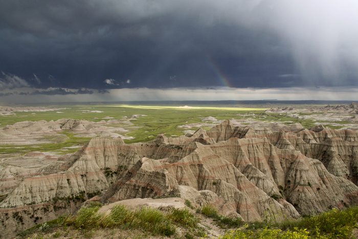 Located in southwestern South Dakota, Badlands National Park features 244,000 acres of buttes, pinnacles, and spires, as well as the largest mixed-grass prairie in the United States. Badlands National Parks also features Oligocene epoch fossil beds which date back as far as 35,000,000 years. Fossils from ancient rhinos, horses, and sabertooth tigers have been found within the park's boundaries. The park was the site of the reintroduction of the Black-Footed Ferret, the most endangered land animal in North America.