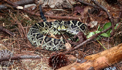 Description: The eastern diamondback rattlesnake (often called diamondback) is the largest pit viper in the United States. At an average length of about 5 feet, it is the largest poisonous snake found in the United States. This beautiful snake is usually brown, gold, or yellowish in coloration with between 24-35 dark diamond-shaped markings on the skin. Each diamond is outlined in yellow or cream-colored scales. The tail is decorated with 5-10 pronounced crossbands. The belly is yellowish in coloration and the head has a distinct stripe that extends from the eye diagonally away from the mouth. When threatened, the diamondback will rattle its tail. The rattle is loud and can be heard from a distance. If the rattle does not chase away the threat, the snake will coil itself in an "S" position before striking at the threat with its fangs. This snake delivers a powerful, painful bite with unusually long fangs. Diamondback venom is often fatal without immediate medical treatment, though these snakes will avoid humans if possible.