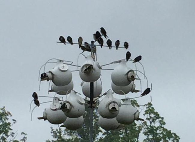 Today, eastern populations of martins are entirely dependent on a dedicated group comprised of thousands of "landlords." across the eastern and central United States. Many landlords are intimately involved with their martin colonies and take great measures to ensure their success. Removing predators, trapping invasive sparrows and starlings, caring for displaced or orphaned young martins, cleaning houses, and providing martins with mealworms or crushed egg shells are just some of the jobs performed on a daily basis by purple martin lovers.