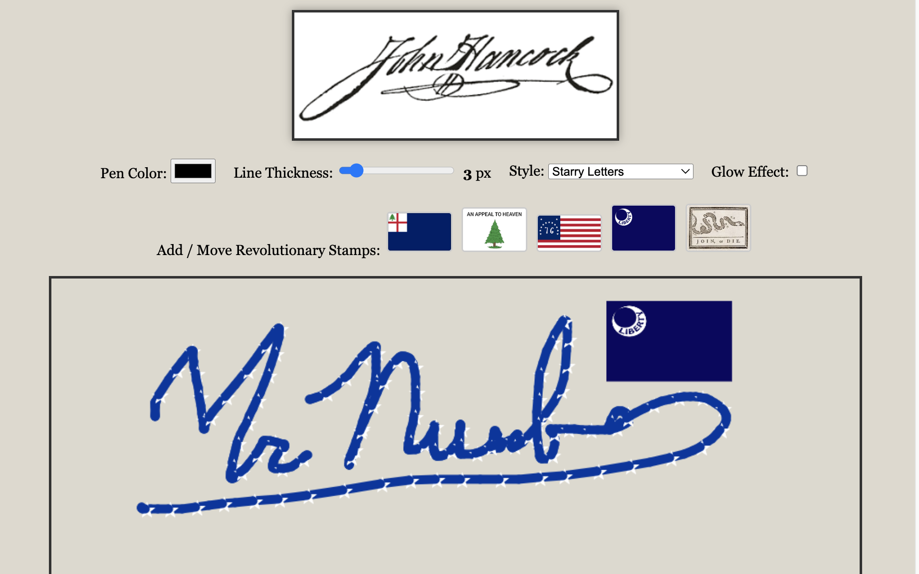 In this interactive activity, students design their own signature in the bold spirit of John Hancock using different pen styles, effects, and Revolutionary War stamps. After creating their masterpiece, they can “publish” it by placing their signature directly onto a section of the Declaration of Independence—just like Hancock did. The challenge blends creativity with history, helping students connect personally to the courage and symbolism of signing the Declaration.